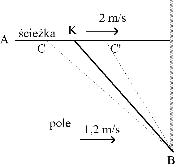 Mê¿czyzna idzie po chodniku z prêdkością 2 m/s, natomiast po wyboistym polu mo¿e iśæ z prêdkością równą najwy¿ej 1,2 m/s. Wyrusza on z punktu A oddalonego o 56 m od ściany (patrz rysunek) i idzie do punktu B, le¿ącego przy ścianie, 48 m na po³udnie od chodnika.