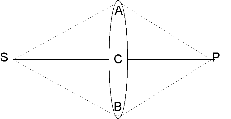 S jest punktowym ¼ród³em świat³a, P - jego obrazem utworzonym przez soczewkê. SC = CP = 1,00 m. Grubośæ soczewki mierzona przy jej krawêdzi wynosi 3,0 mm. Wiedząc, ¿e droga optyczna promienia SCP jest taka sama jak promieni SAP i SBP, oblicz, jaka jest grubośæ soczewki w pobli¿u punktu C? (Przyjmij, ¿e wspó³czynnik za³amania szk³a jest równy 1,60.)