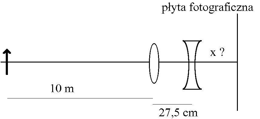 Uk³ad optyczny teleobiektywu sk³ada siê z soczewki skupiającej o ogniskowej f1 = +30 cm oraz soczewki rozpraszającej o ogniskowej f2 = -10 cm. Odleg³ośæ pomiêdzy tymi soczewkami wynosi 27,5 cm. Gdzie powinna byæ umieszczona p³yta fotograficzna, aby mo¿na by³o sfotografowaæ przedmiot le¿ący w odleg³ości 10 m przed pierwszą soczewką?