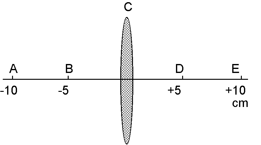 Ogniskowa soczewki przedstawionej na rysunku równa jest 5 cm. W którym z punktów A, B, C, D lub E, a mo¿e w pobli¿u którego z nich, usytuowany jest obraz, gdy