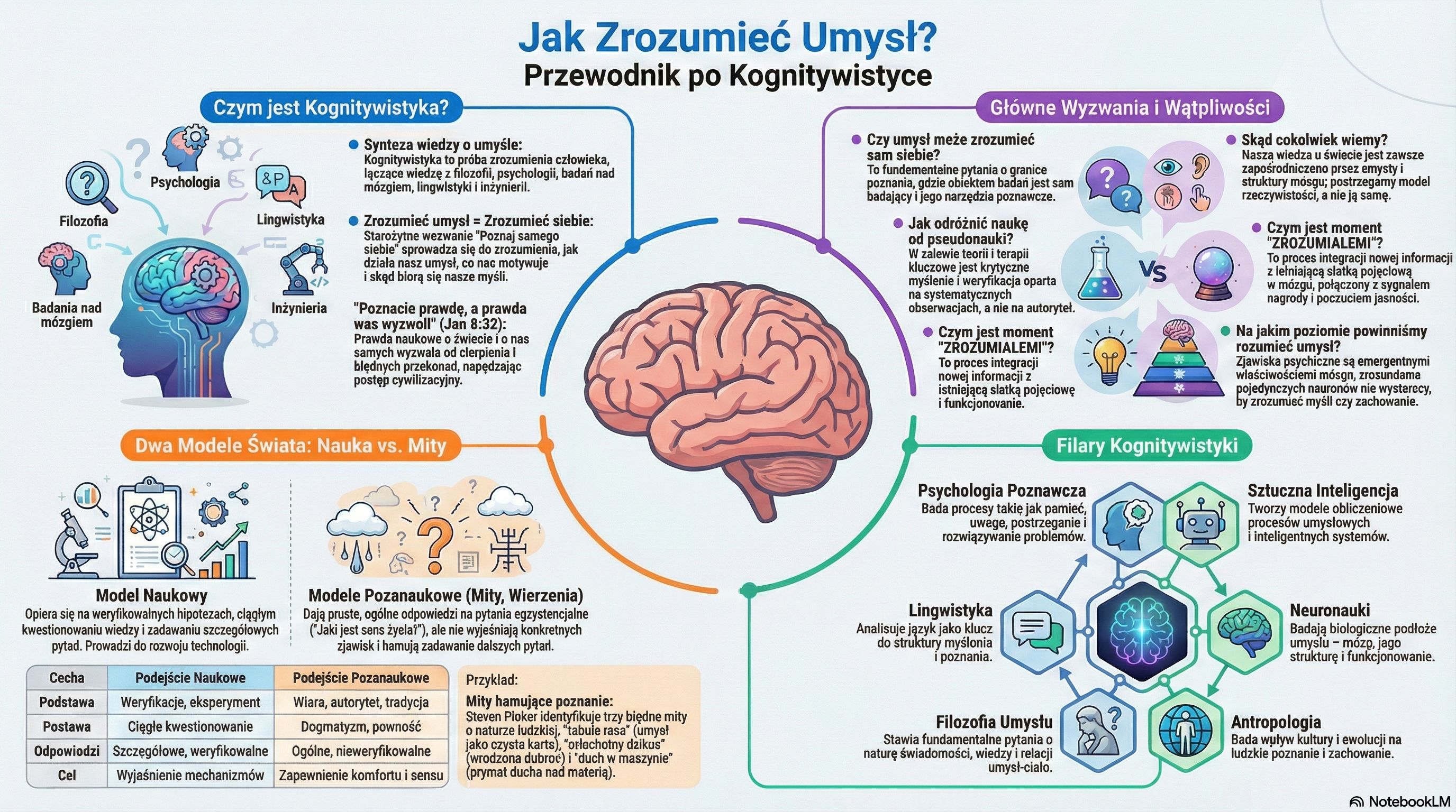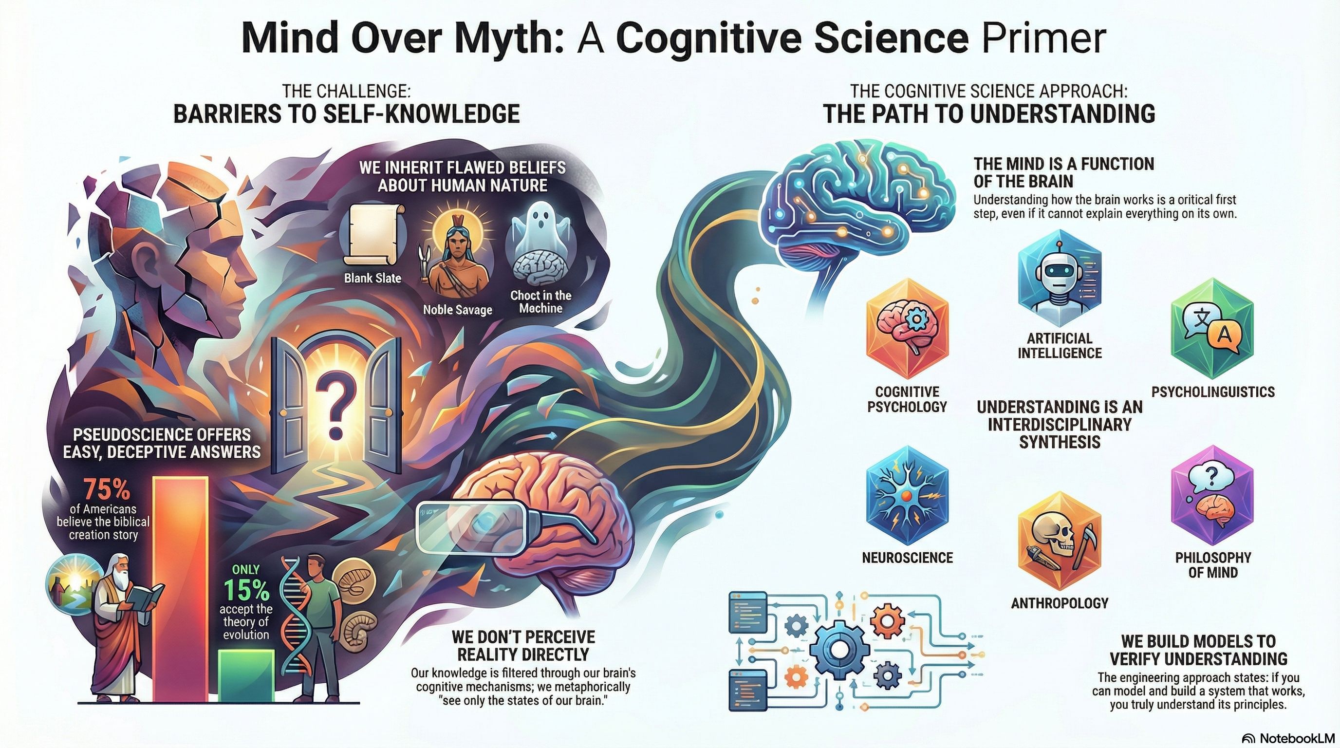 W tej części dowiemy się czym zajmuje się kognitywistyka, jakie są historyczne źródła pojęć opisujących stany mentalne, jakie są tu popularne błędy i teorie, które niewiele wyjaśniają lub stwarzają tylko pozory wyjaśnień. Najpierw mamy ogólne uwagi na temat oczekiwań wobec kognitywistyki i historii jej powstania, potem mitów i historii pojęć, a następnie różnych paranauki i nieporozumień wynikających z braku krytycznego podejścia i niezrozumienia problemu. Potem omówimy podstawy ewolucyjne rozwoju układu nerwowego i podstawowe mechanizmy jego działania.