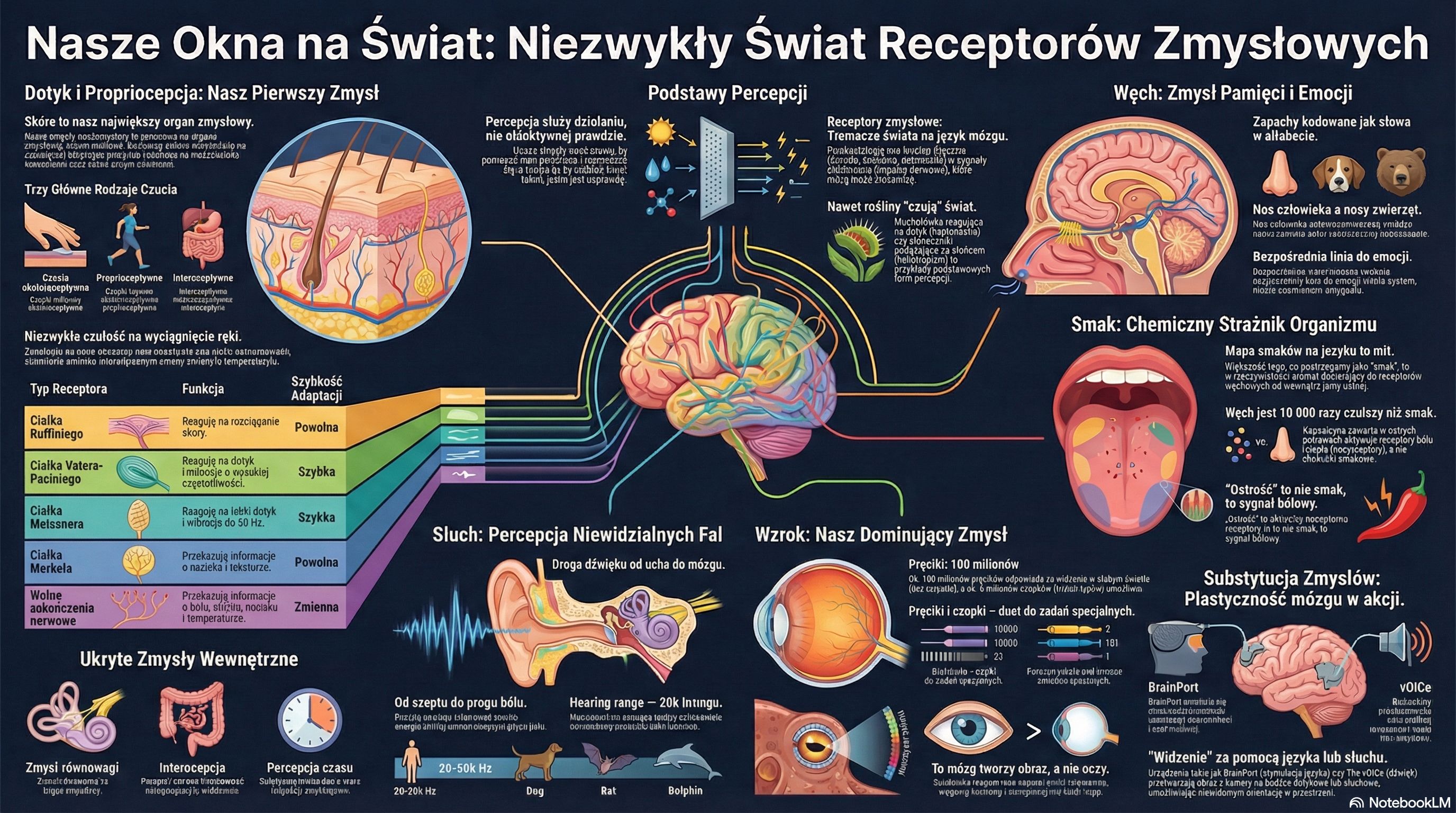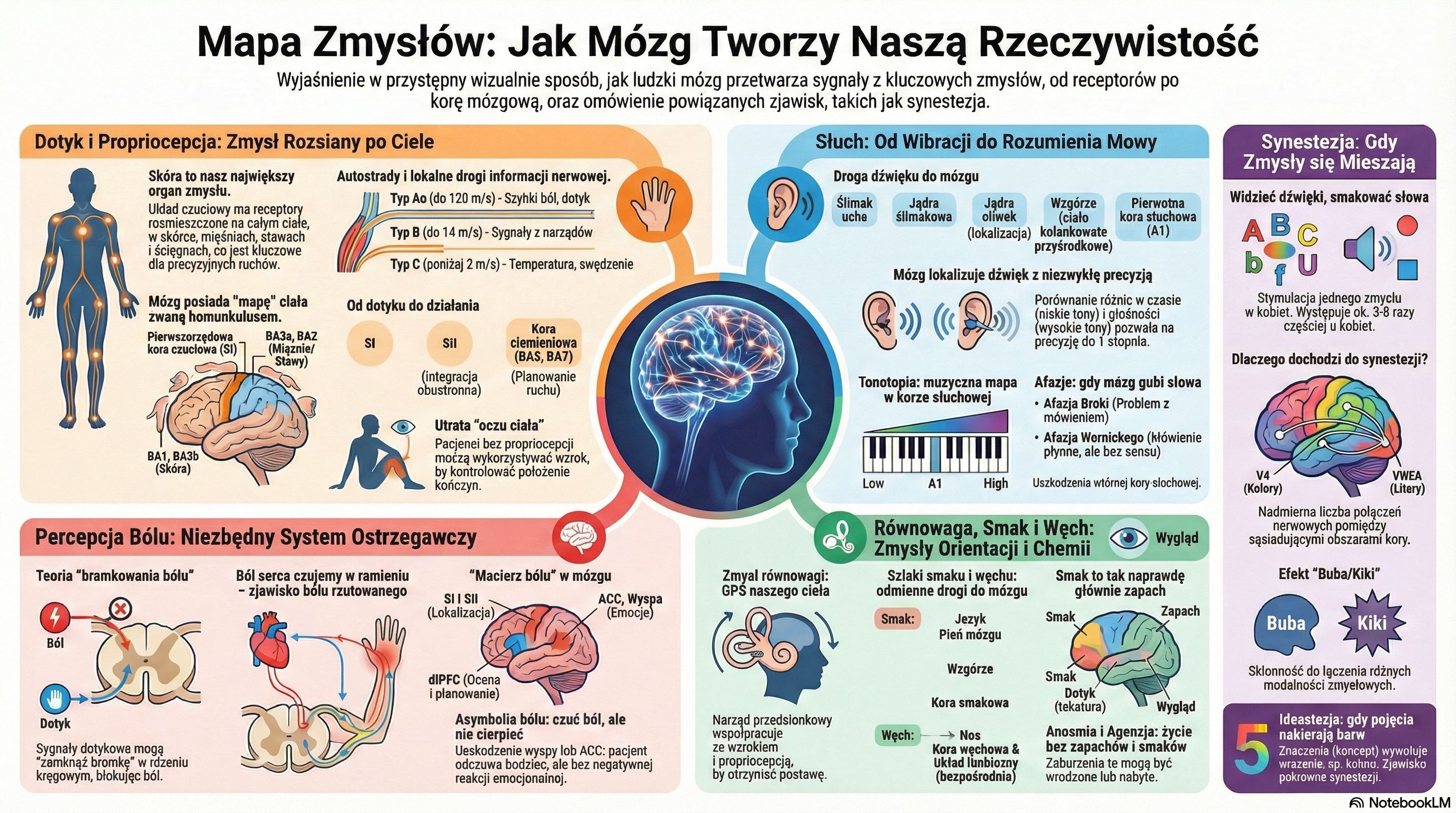 16.1. Czucie i kora somatosensoryczna | 16.2. Słuch i percepcja muzyki | 16.3. Zmysł równowagi | 16.4. Smak | 16.5. Węch i kora węchowa | 16.6. Synestezje i ideastezje