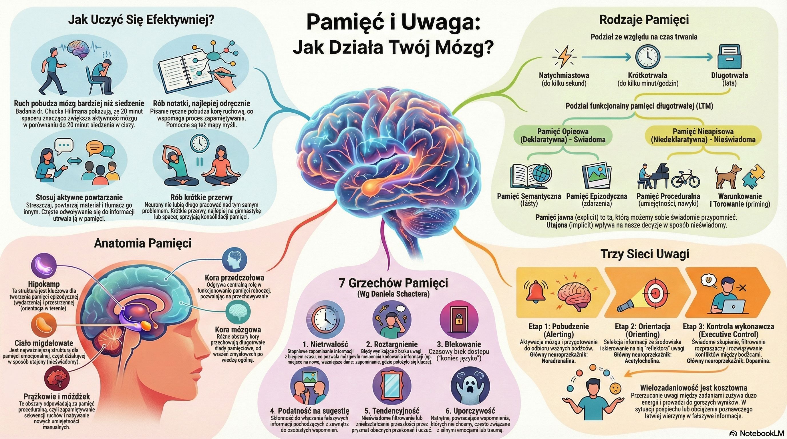 20.1. Rodzaje pamięci | 20.2. Anatomia pamięci | 20.3. Pamięć epizodyczna | 20.4. Pamięć semantyczna | 20.5. Pamięć robocza | 20.6. Zaburzenia pamięci | 20.7. Niedoskonałości pamięci | 20.8. Uwaga