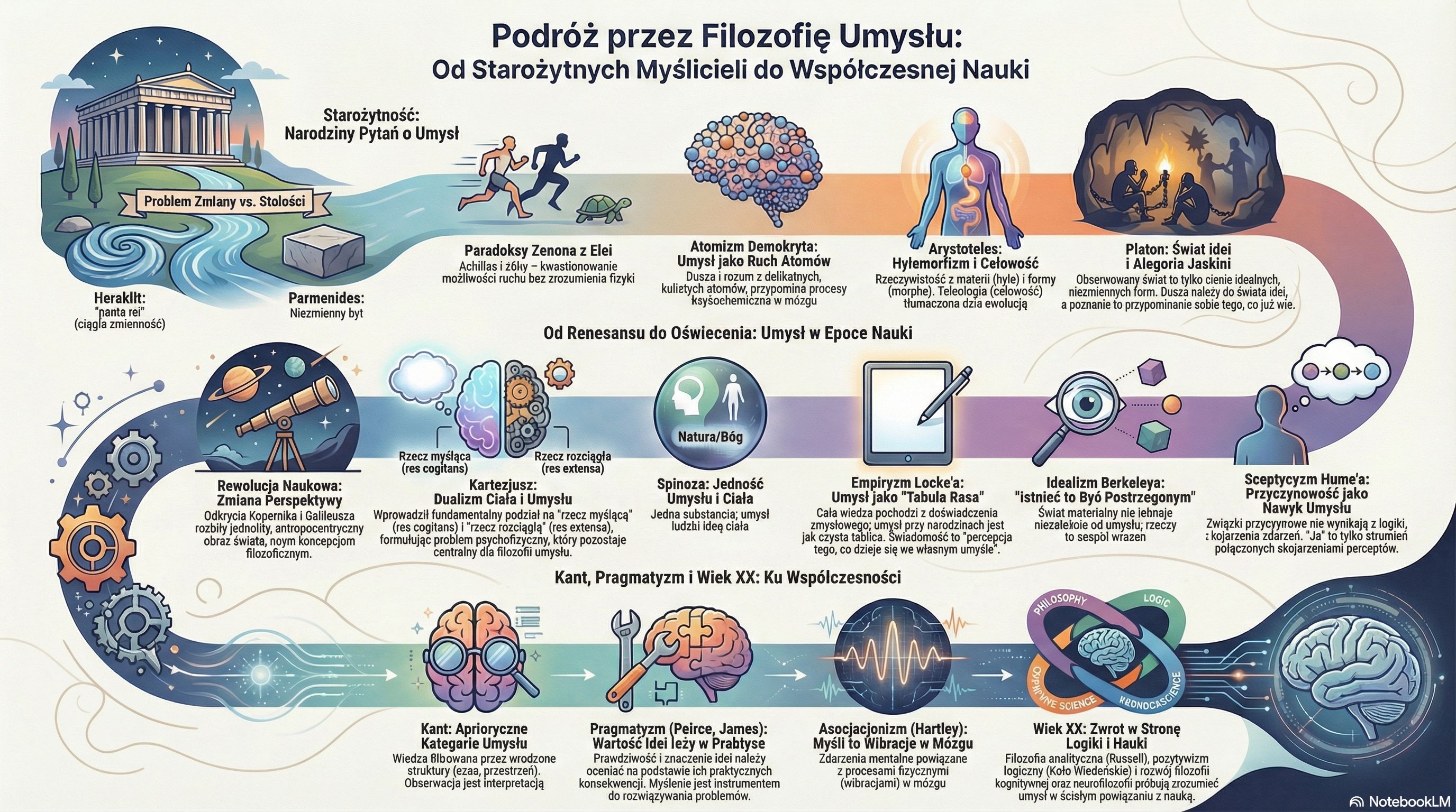 Starożytność: Filozofia presokratejska | Atomizm i fizyka współczesna | Arystoteles i problem tożsamości | Platon i abstrakcyjne idee | Renesans filozofii: Kartezjusz | Spinoza | Mechanicyzm | Locke - empiryzm | Berkeley - idealizm | Hume - sceptycyzm | Hartley - asocjacjonizm | Reid - rozsądek | Kant |