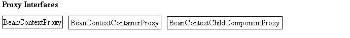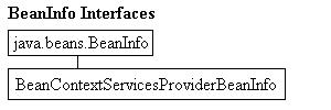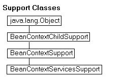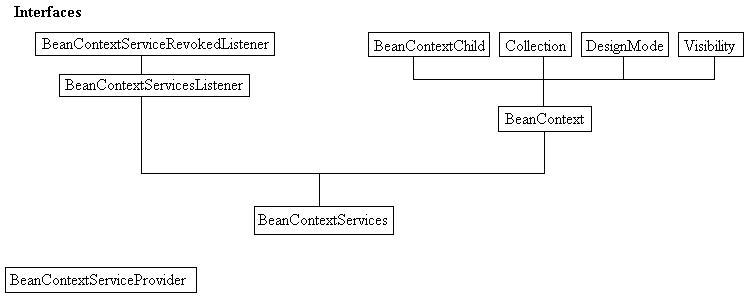 The classes and interfaces relevant to the BeanContext API are listed in the following diagrams. As you study the diagrams, take note of the BeanContext and BeanContextServices interfaces, and that each has its own concrete implementation that you can subclass or instantiate directly (classes java.beans.beancontext.BeanContextSupport(in the API reference documentation) and java.beans.beancontext.BeanContextServicesSupport(in the API reference documentation) respectively). Also take note of the location of the java.beans.beancontext.BeanContextChild(in the API reference documentation) interface. This is the interface that allows nested JavaBeans to become aware of their enclosing BeanContext.