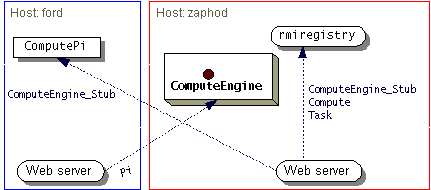 ComputeEngineserver binds its remote object reference in the registry, the registry downloads theComputeEngine_Stub, as well as theComputeand theTaskinterfaces on which the stub class depends. These classes are downloaded from theComputeEngine's web server or file system, as the case may be.The