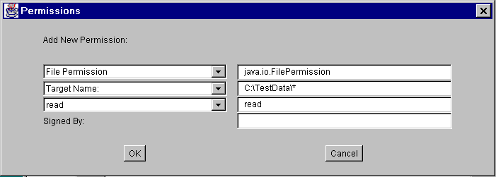 To grant code signed bysusanpermission to read any files in theC:\TestDatadirectory, you need to create a policy entry granting this permission. Note that "Code signed bysusan" is an abbreviated way of saying "Code in a class file contained in a JAR file, where the JAR file was signed using the private key corresponding to the public key that appears in a keystore certificate in an entry aliased bysusan."Choose the Add Policy Entry button in the main Policy Tool window. This brings up the Policy Entry dialog box: