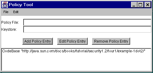 Click the image to view it at its natural size.A policy entry specifies one or more permissions for code from a particular code source - code from a particular location (URL), code signed by a particular entity, or both.